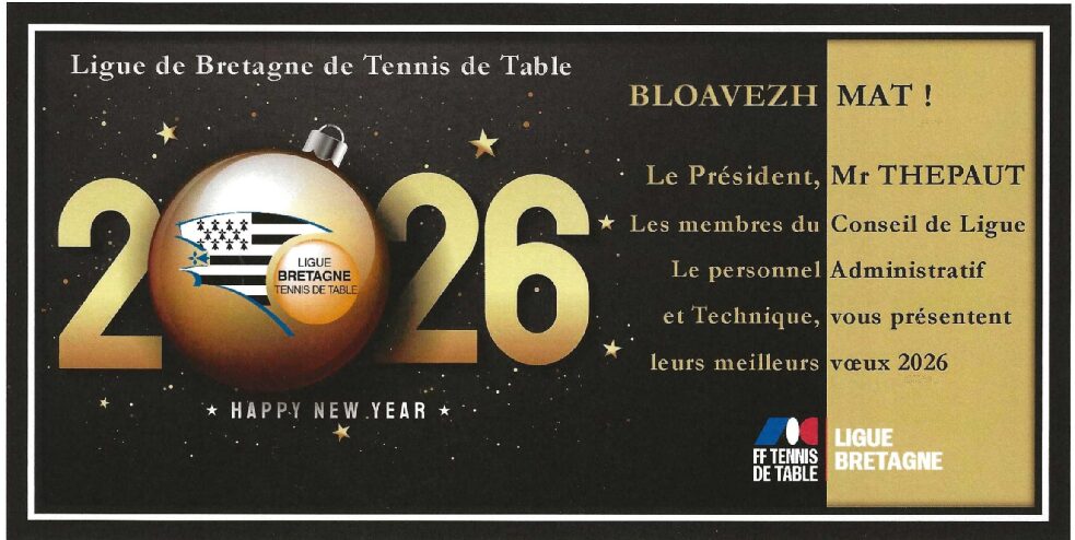 La Ligue de Bretagne de tennis de table vous présente tous ses meilleurs vœux pour cette nouvelle année 2026 à vous et à vos familles en souhaitant que tous vos projets qu’ils soient familiaux, associatifs ou professionnels aboutissent.
